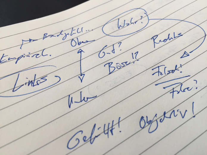 Wenn ich mit meiner Vermutung richtig liege, dass wir zur Zeit einen grundlegenden Kategorien-Wechsel im politischen Raum erleben, so stellt sich vor dem Hintergrund dieser Beispiele die dringende Frage, ob und wie es möglichst gewaltlos gelingen kann, die neuen Kategorien nicht nur zu erkennen und zu beschreiben, sondern durch Unter- oder Nebenordnung mit anderen Kategorien das System und die Institutionen so umzugestalten, dass konstruktive politische und gesellschaftliche Auseinandersetzung zwischen kontroversen Positionen wieder in einem gemeinsamen Rahmen möglich wird. Nach welchen Kategorien wird sich unsere politische Landschaft organisieren? Welche sind „führend“, welche sind „folgend“? Welche Mechanismen werden wir nutzen, um Positionen, Interessen und Ansichten zwischen den verschiedenen Polen des Spektrums zu vermitteln? Oder – wenn meine Hypothese über die neuen Kategorien von oben stimmt – ganz konkret: Wie können wir eine gemeinsame Basis zur Diskussion zwischen Positionen finden, in denen „objektive Wahrheit“ einerseits gegen „subjektiv gefühlte Wahrheit“ andererseits steht?